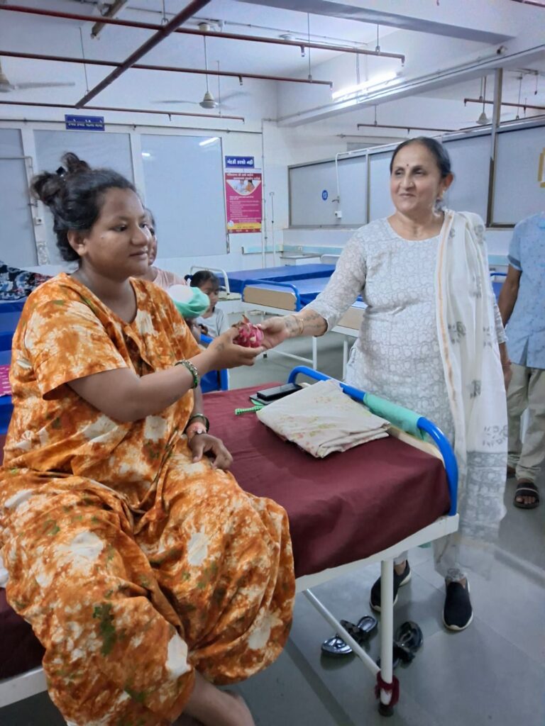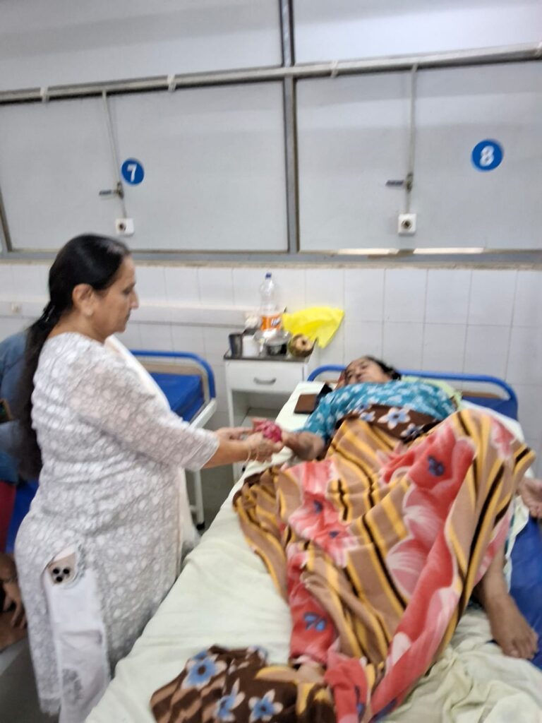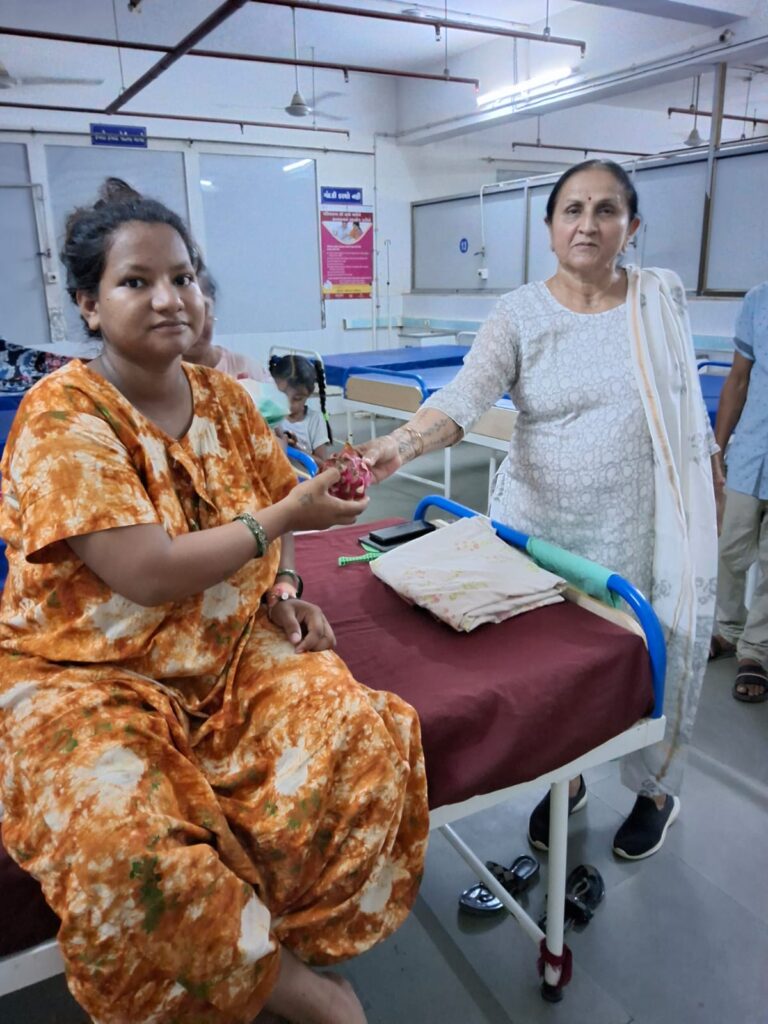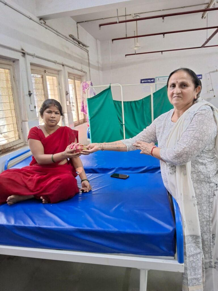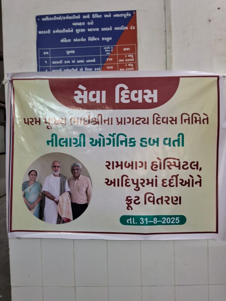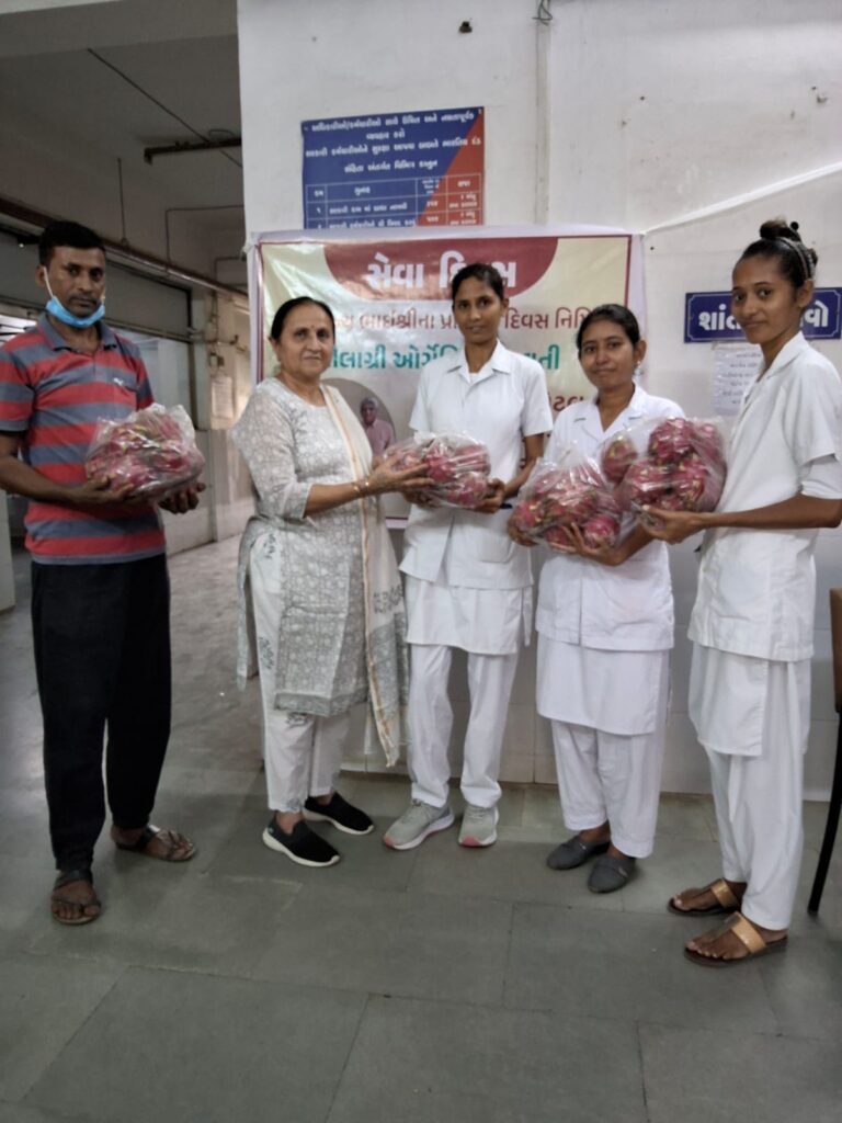 Fruit distribution to patients at Rambagh Hospital, Adipur on behalf of NEElagri Organic Hub on the occasion of Pujya Bhaishree’s birth anniversary